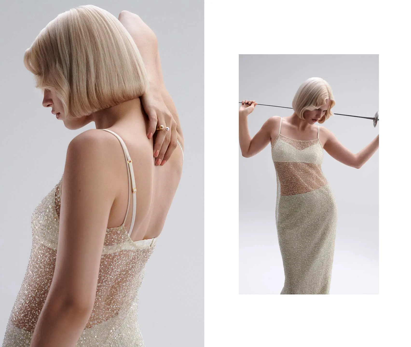 Perfekte Geometrie in perfekter Länge. Der lange, abgerundete Pony und das sanft gestufte Deckhaar geben dem Bob Dynamik und viel Bewegung, die Volumising Spray mit flexiblem Halt unterstützt. Präzises Färben mit einem monochrom sandfarbenen Toner akzentuiert die Linien und Konturen des Cuts und verleiht dem blondierten Haar Glanz.